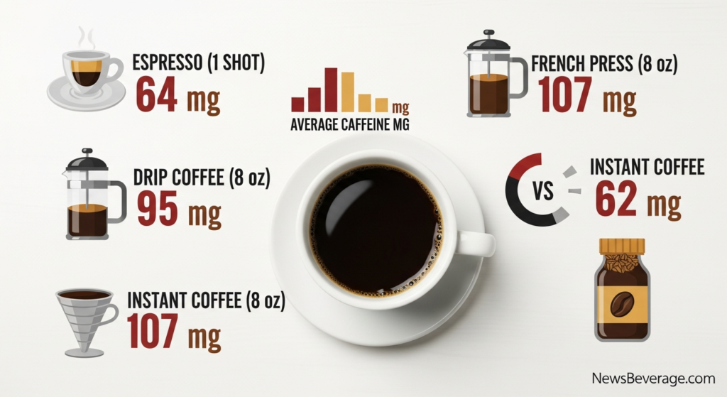 Your brewing method makes a massive difference in how much caffeine ends up in your cup. Different methods extract caffeine at different rates.